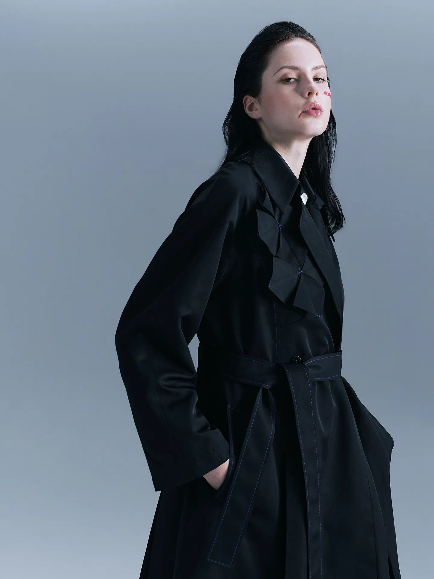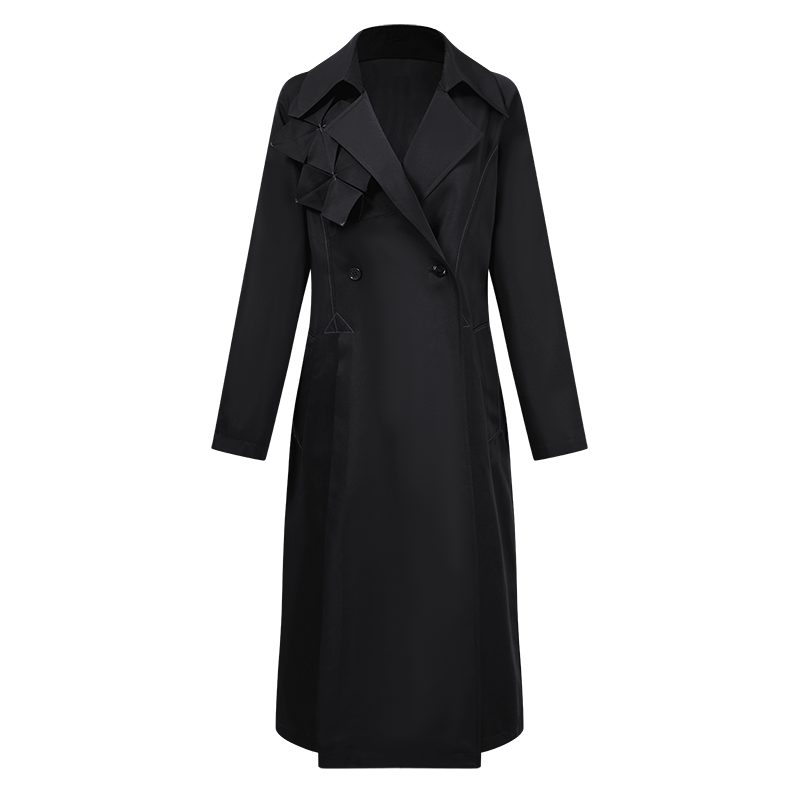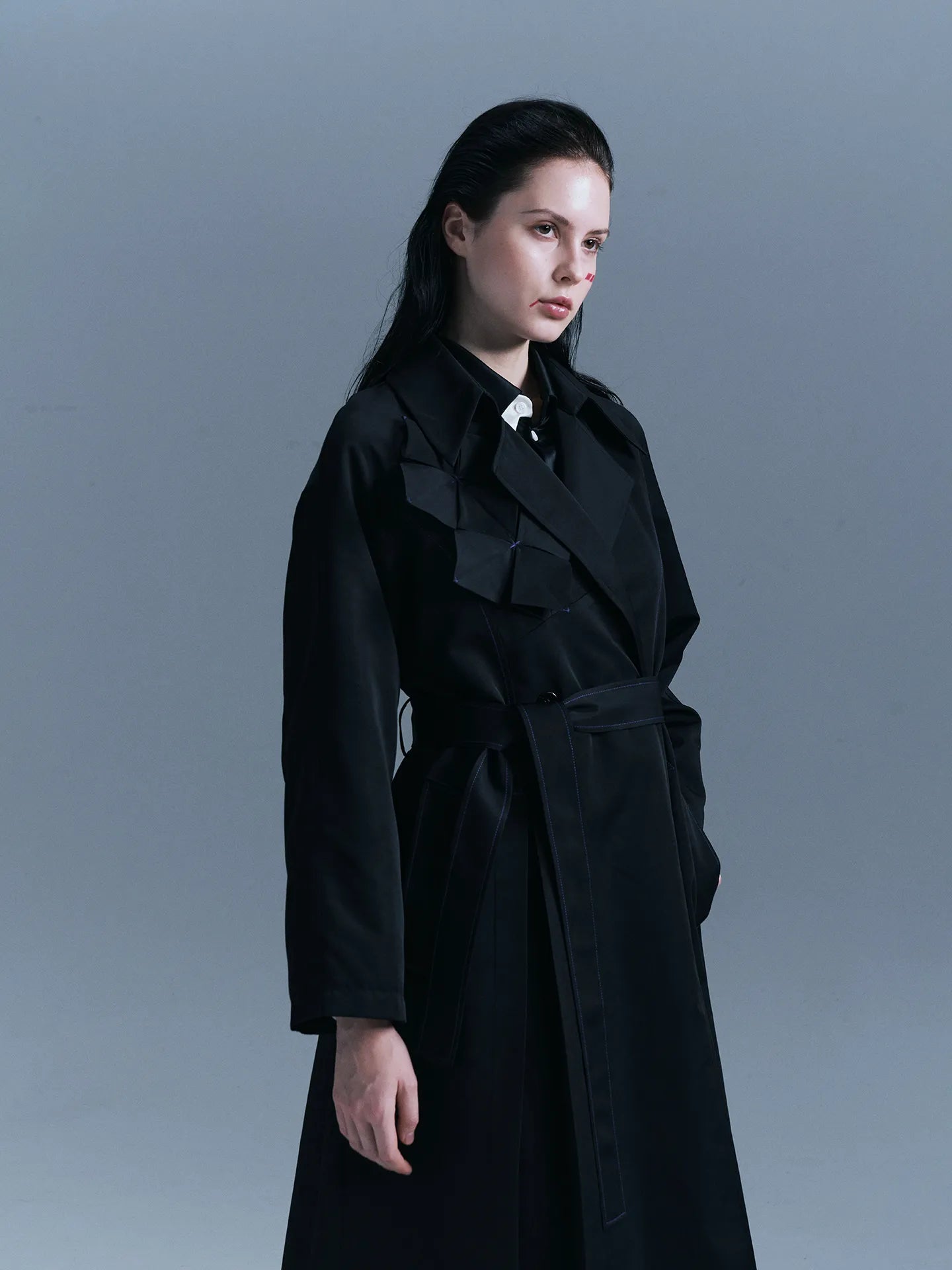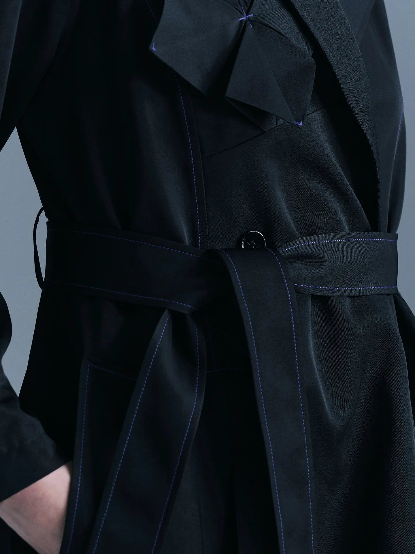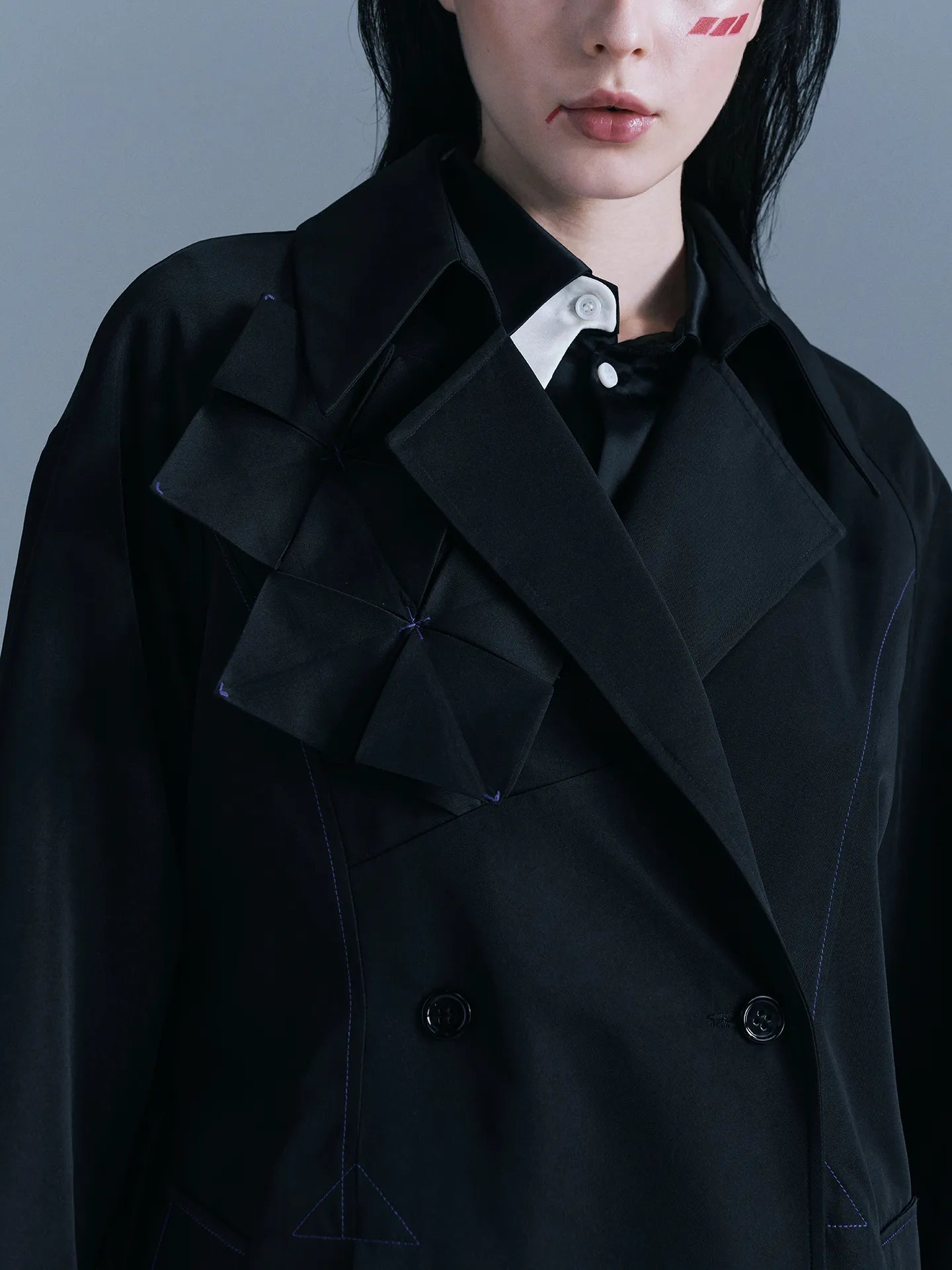 • The shoulders are decorated with origami flower art details. The front is designed with double-breasted buttons, and the entire body is decorated with purple contrasting bright lines. It is paired with an adjustable belt to create a versatile silhouette. It is equipped with side pockets and is of medium length.
