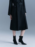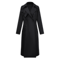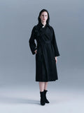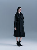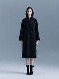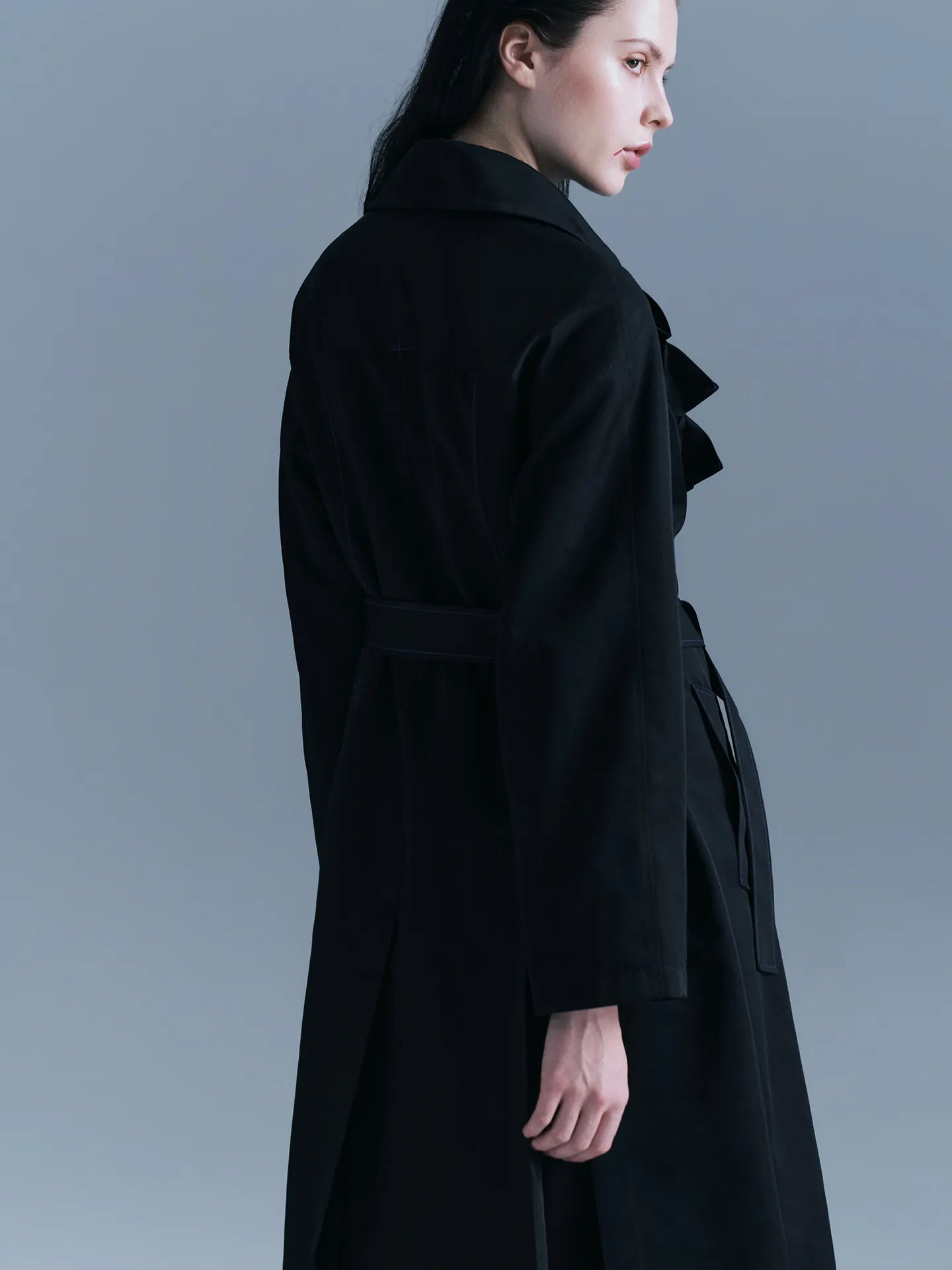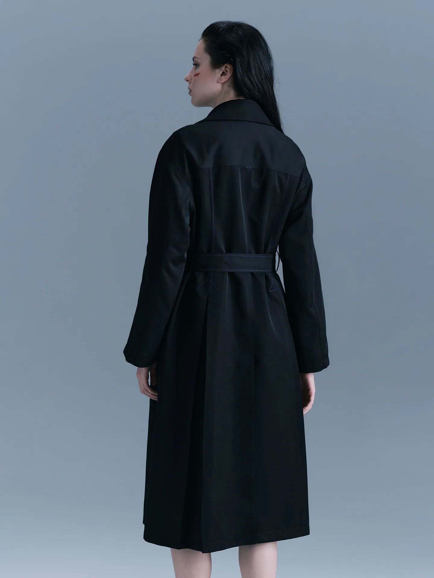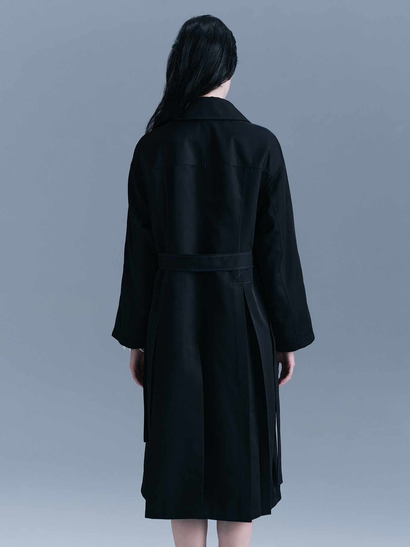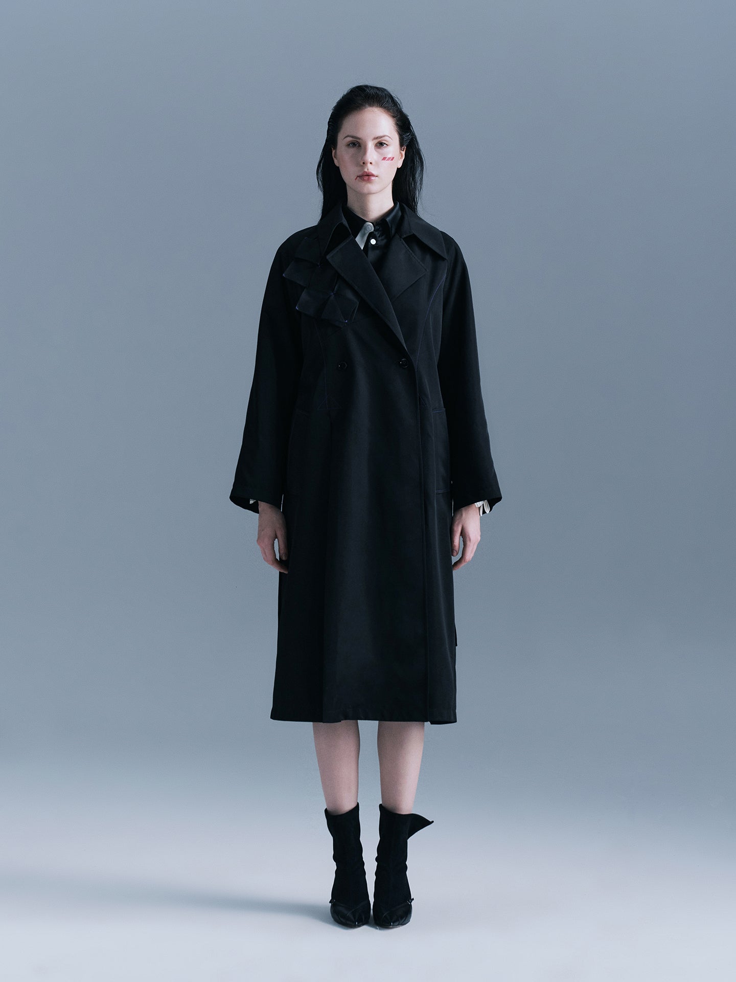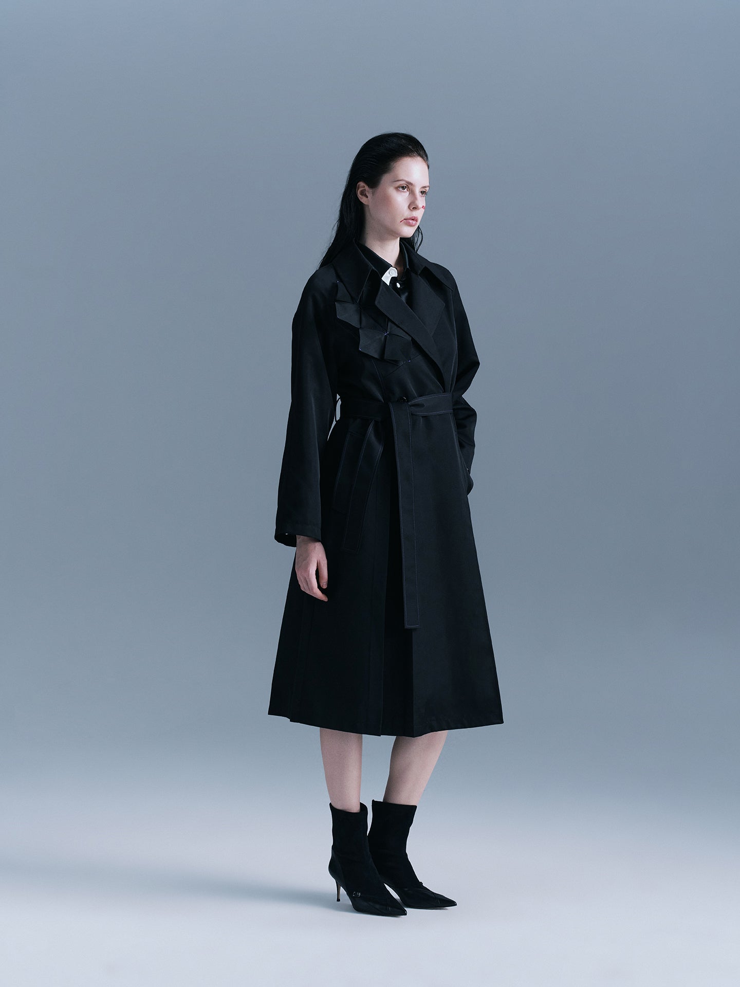 • The shoulders are decorated with origami flower art details. The front is designed with double-breasted buttons, and the entire body is decorated with purple contrasting bright lines. It is paired with an adjustable belt to create a versatile silhouette. It is equipped with side pockets and is of medium length.