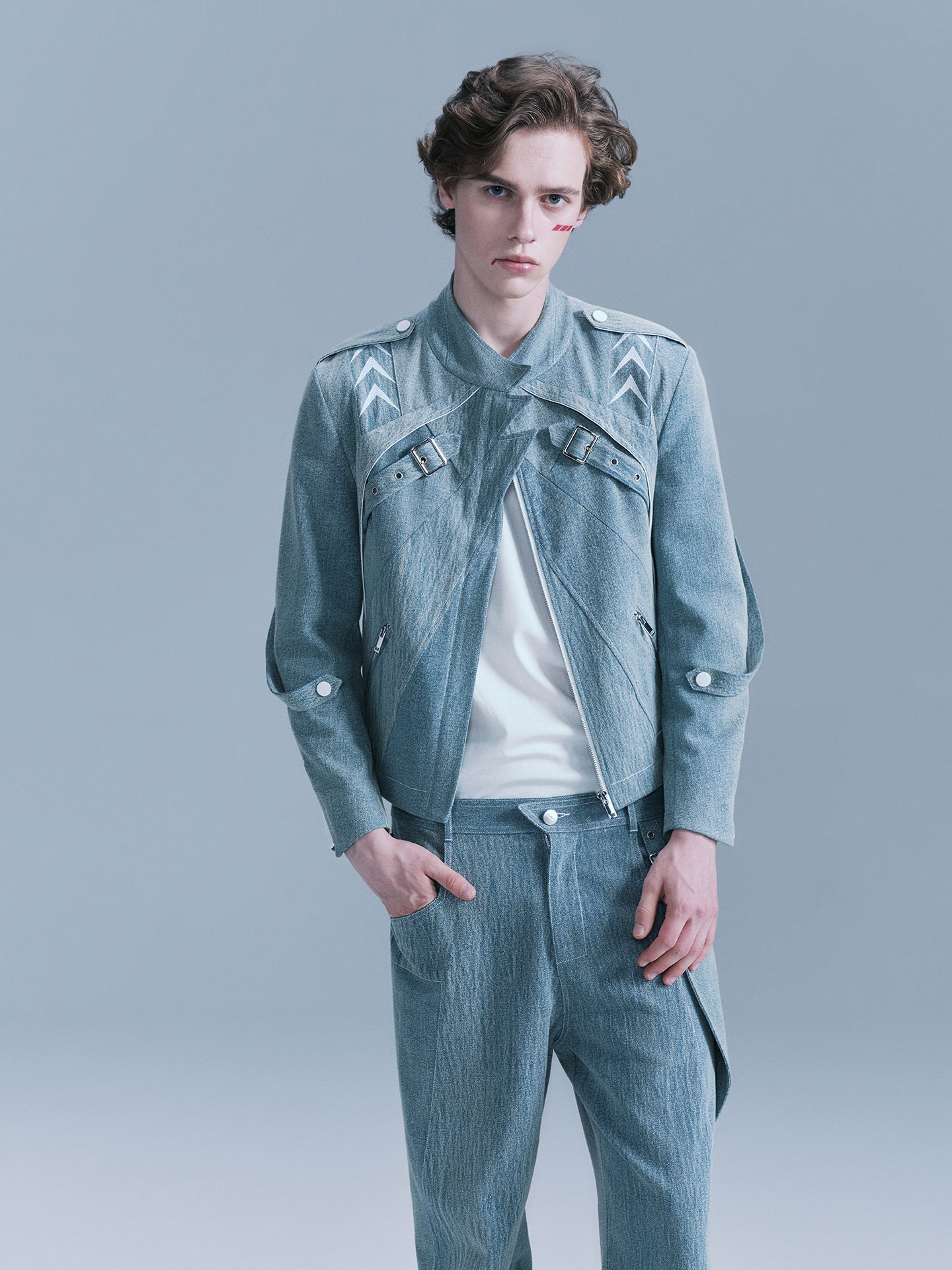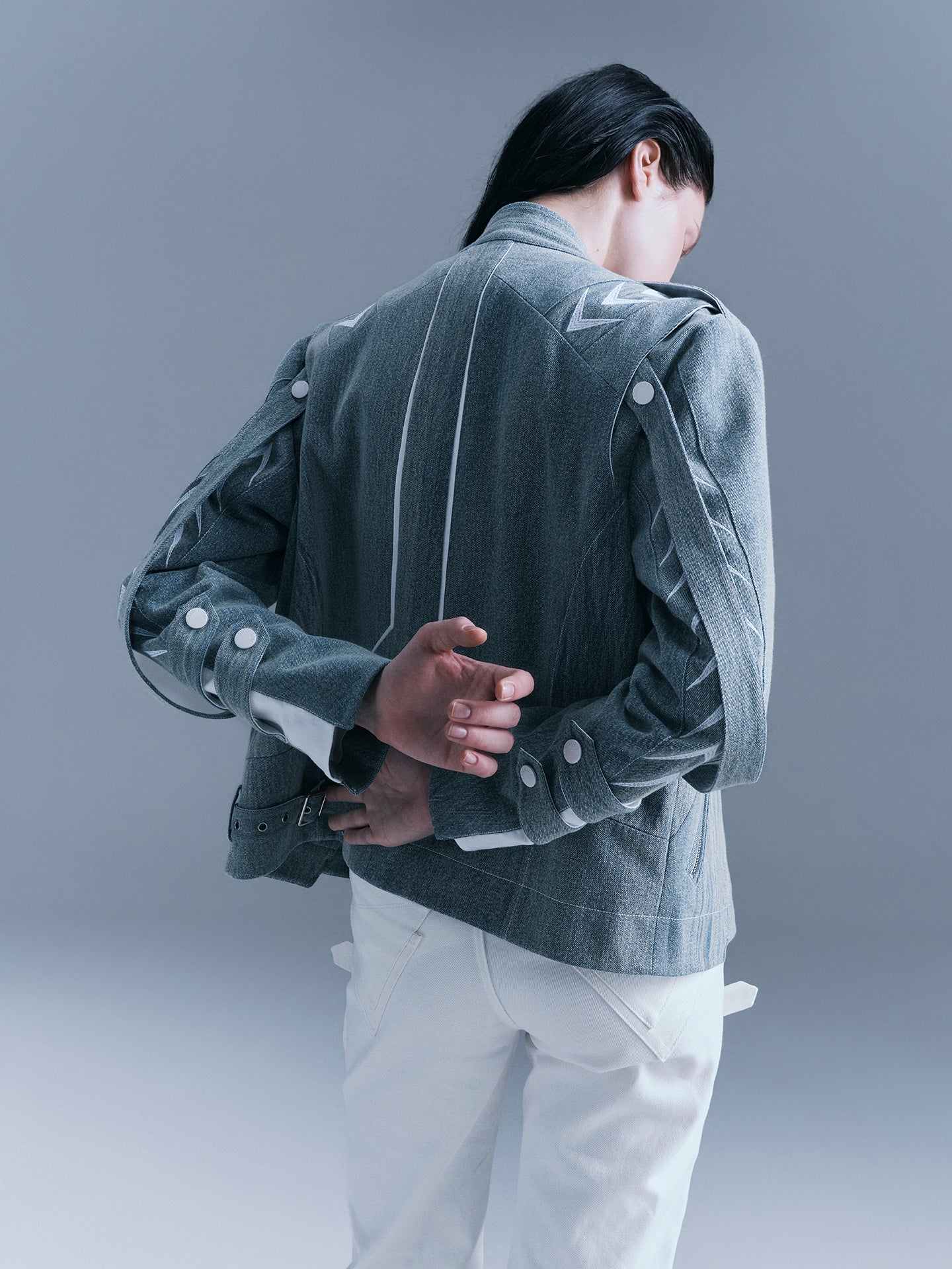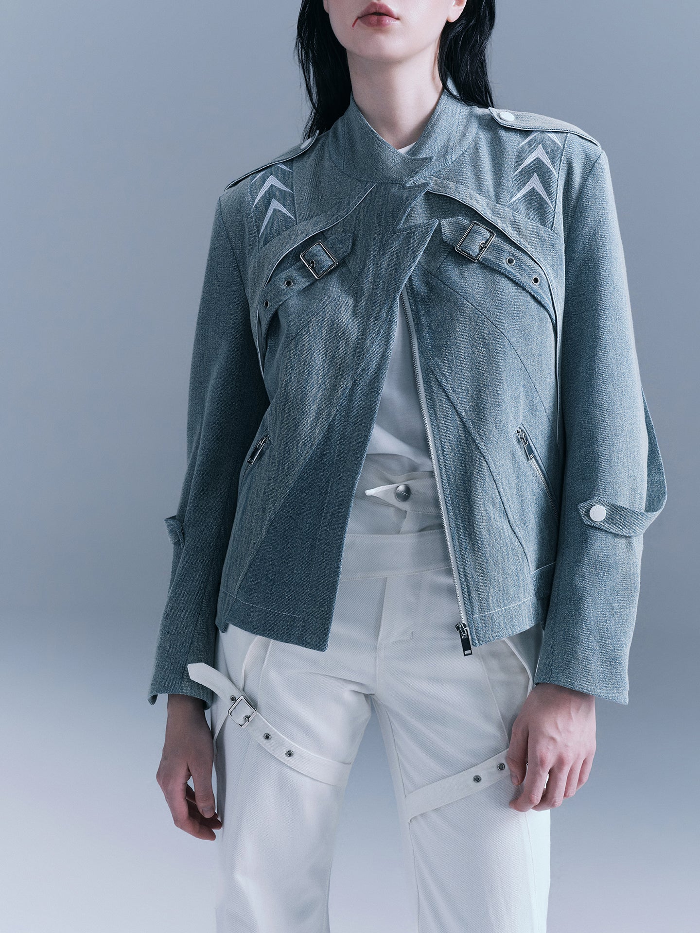 - There are white arrow embroideries on the shoulders and sleeves