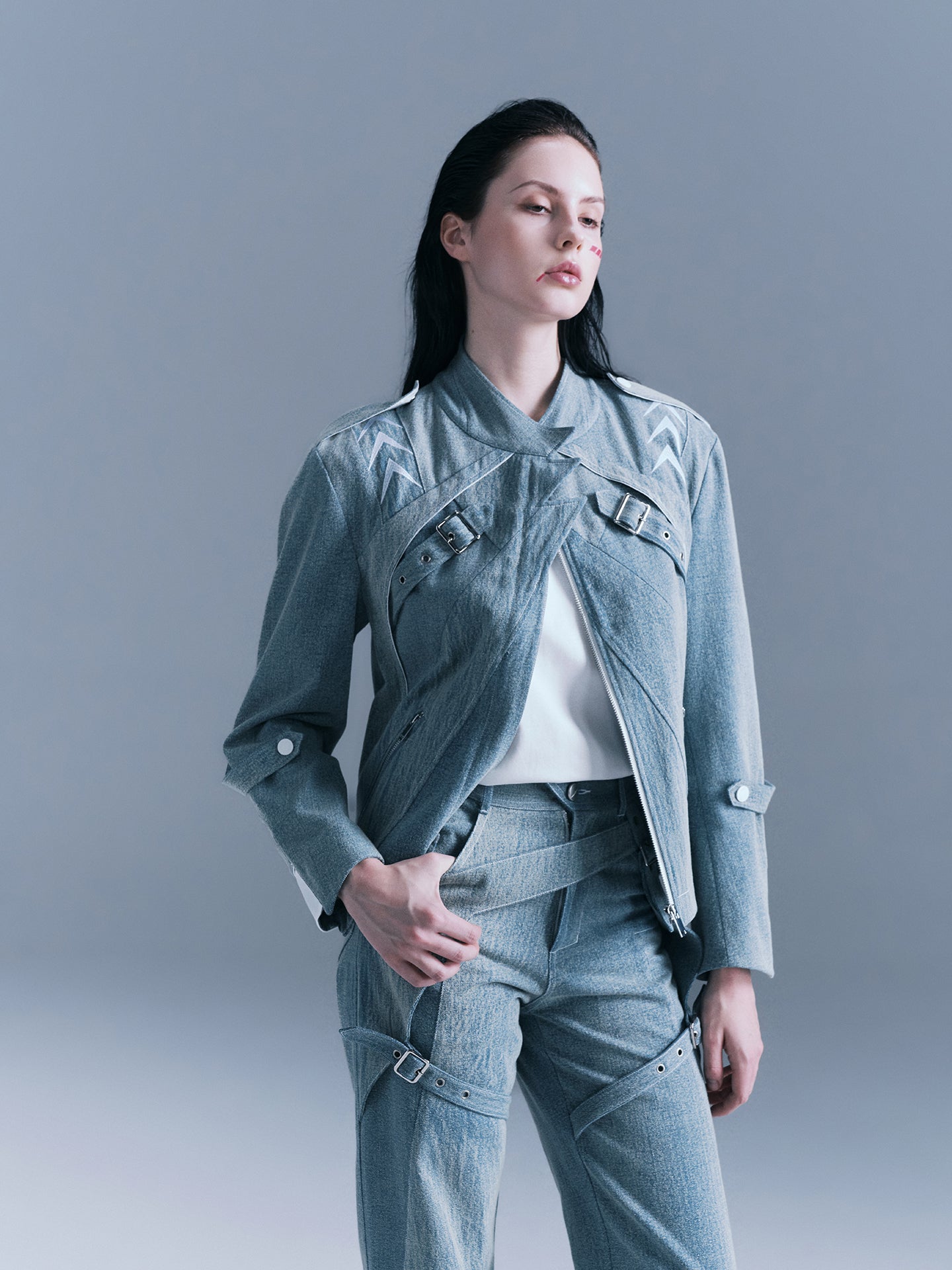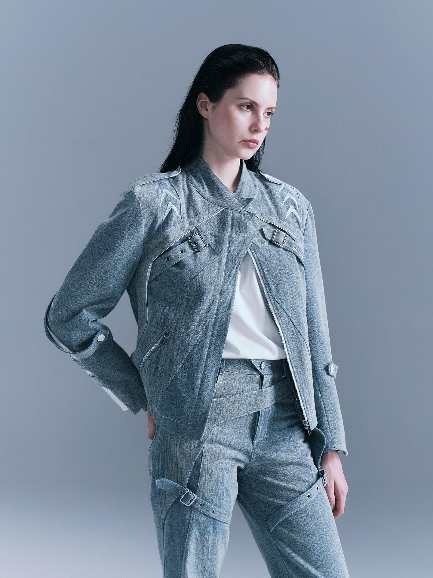 - Metal buckle design on the front chest