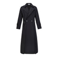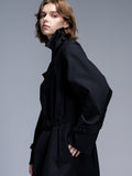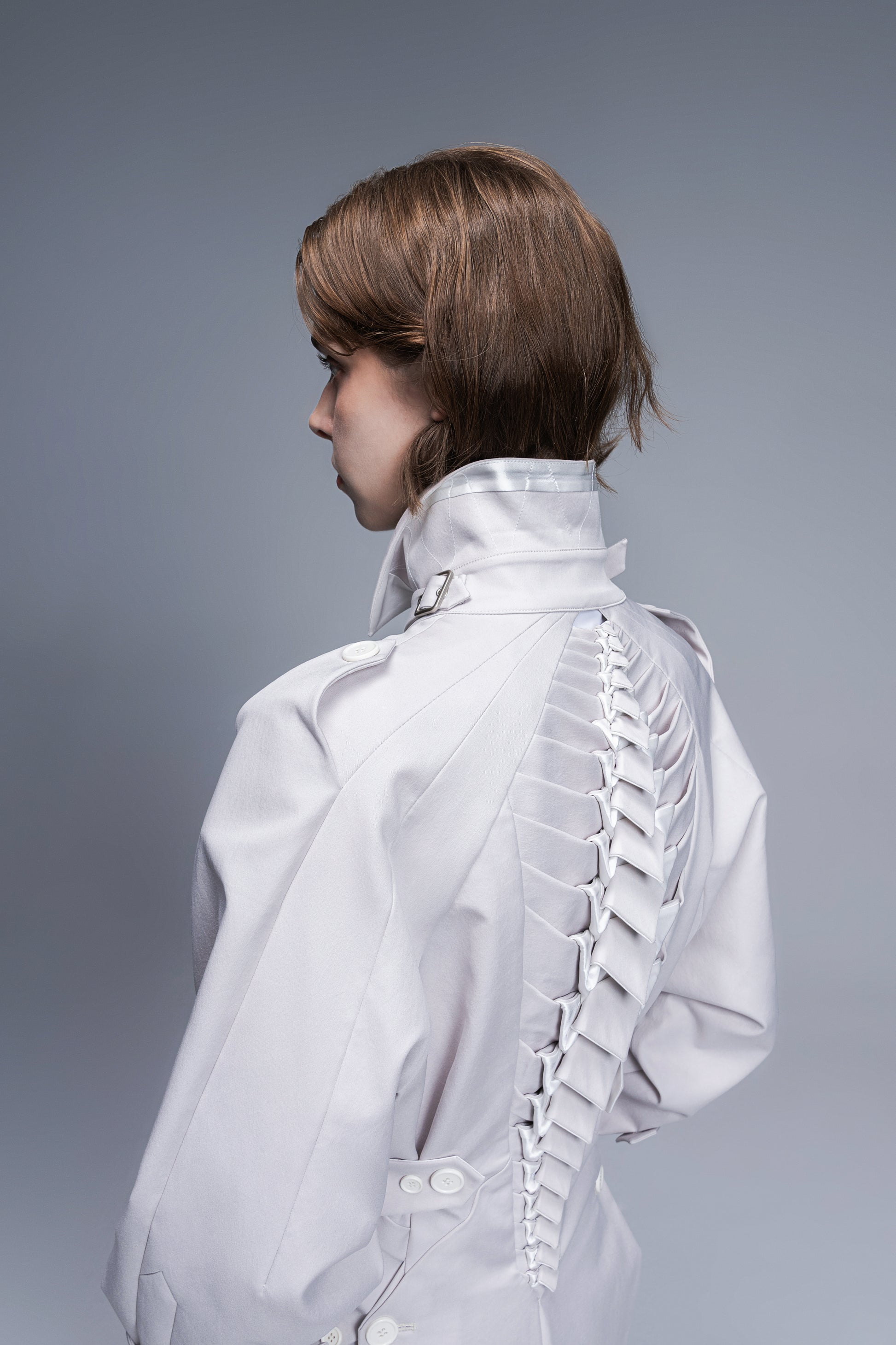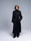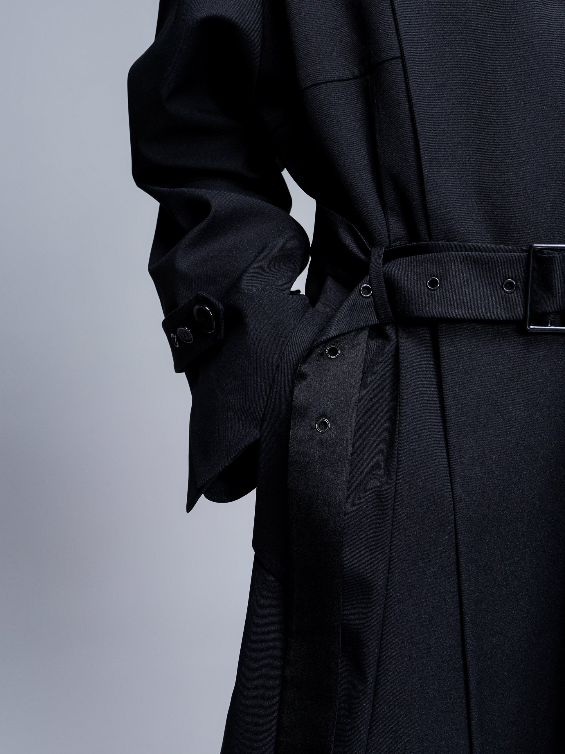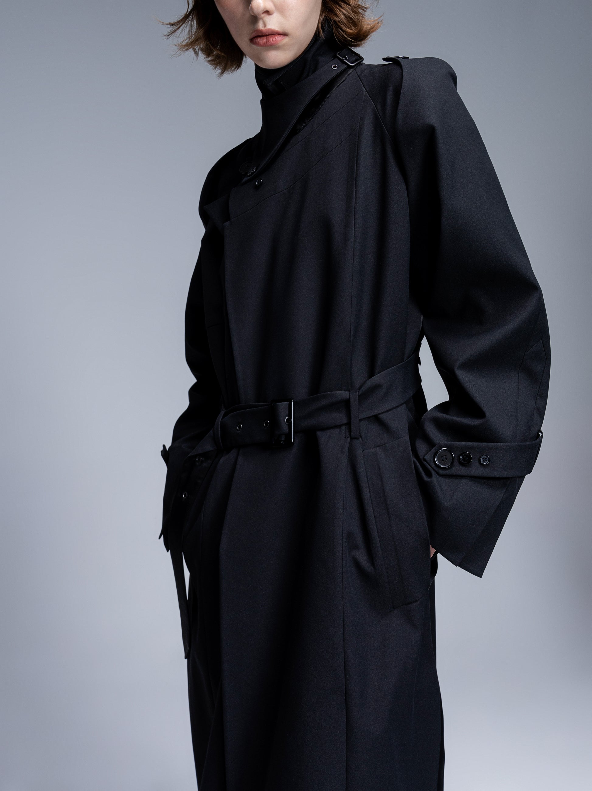 - Designed as a classic double-breasted front, it is equipped with an adjustable belt and button cuffs. The back features eye-catching dragon skeleton sculptural details, a long cut and practical side pockets